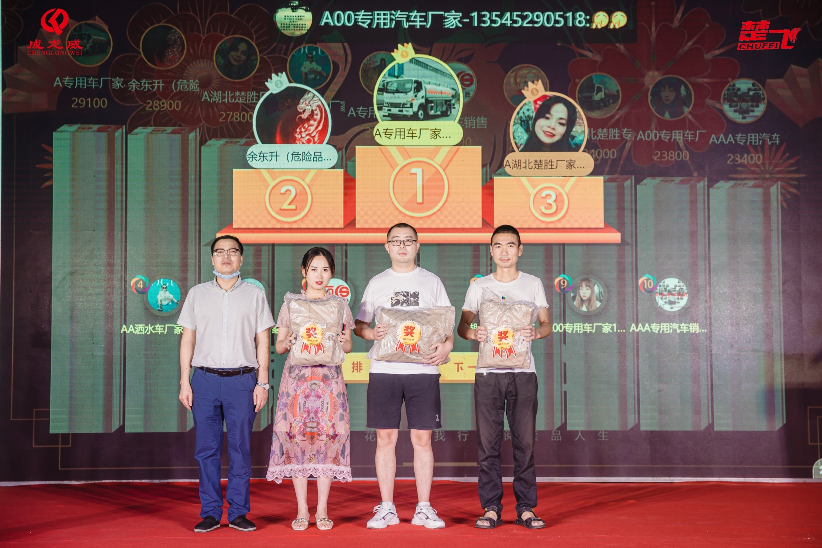 成龙威专汽董事长刘永财先生、 总经理刘鼎先生、销售总经理刘振兴、销售部长胡婷婷、生产经营总经理余胜涛先生一并上台, 为今天的晚宴祝酒!今晚经销商们一同享受一下成龙威专汽为您准备的美食与美酒!